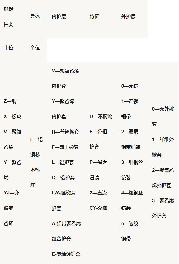 用漢語拼音第一個字母的大寫表示導體材料、絕緣種類、內(nèi)護層材料和結(jié)構(gòu)特點。